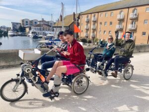 - All-ages Accessible Rides from our seafront base: At this service we train carers, friends, family to pilot. Cycling out together aboard the same Trike! Variety of pedal/ no-pedal/ electric-assist trikes available.