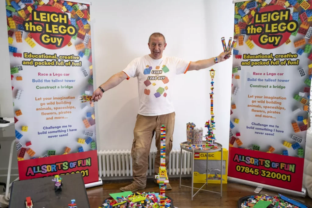 ‘Introducing Leigh The Lego Guy for Lego building parties, 5yrs and upwards. Creative, educational, challenging & imaginative! Race a Lego car, build the tallest tower, construct a bridge a rocket or an animal. Play LEGO races and games!