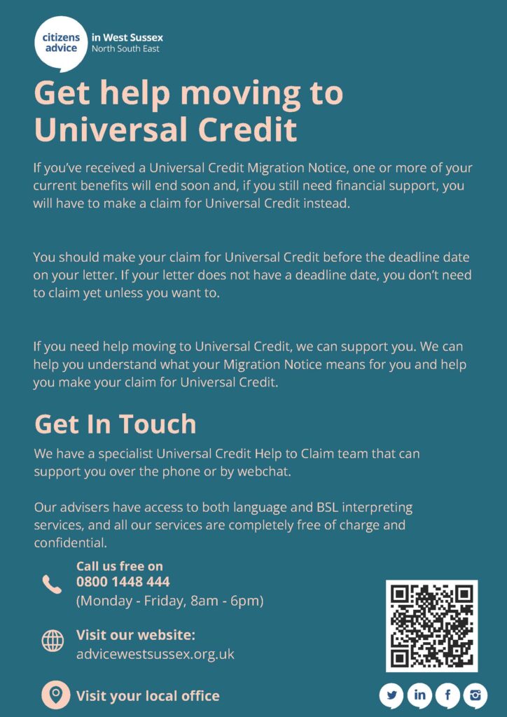 The Department of Work and Pensions (DWP) has started issuing Universal Credit Migration Notices to customers in West Sussex letting them know that one or more of their benefits will be ending and inviting them to apply for Universal Credit. This will continue throughout 2024/25, with some customers being migrated as late as 2028. Customers already on Universal Credit will not receive a Migration Notice.